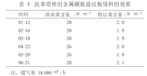 山西古縣錦華焦化廠 2 800mm× 3 000mm洗苯塔采用的是金屬螺旋波紋板填料,裝填填料99m 3,配套400kt/a焦化項(xiàng)目,填料總造價(jià)59.40萬(wàn)元。自2005年投產(chǎn)至今,使用效果尚可,其主要缺陷在于填料造價(jià)太高。 2009年洗苯塔前、后苯含量如表3。