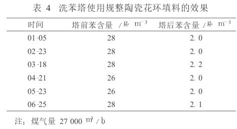 山西古縣晉豫焦化廠 3 400mm× 3 000mm洗苯塔使用的是規(guī)整陶瓷花環(huán)填料,裝填填料145m 3,配套600kt/a焦化項(xiàng)目,填料總造價(jià)19.58萬(wàn)元。自2005年12月投產(chǎn)至今,使用效果良好。 2009年洗苯塔前、后苯含量如表4。